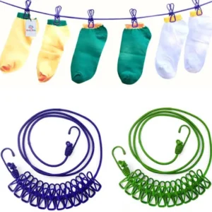 Keep your clothes drying effortlessly, no matter where you are, with the Portable Clothesline with 12 Clips & 2 Hooks. Designed for both indoor and outdoor use, this versatile drying rope is perfect for travel, camping, and home use. Whether you’re drying clothes, towels, or delicates, this wind-proof clothesline offers a durable, adjustable solution for all your drying needs.